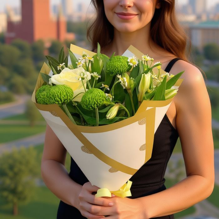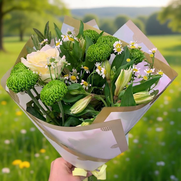 Букет из роз, альстромерий и хризантем "Зеленое чудо"