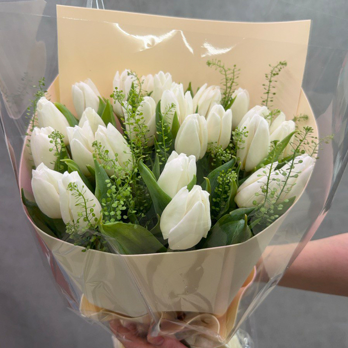 Букет из 25 белых тюльпанов в упаковке