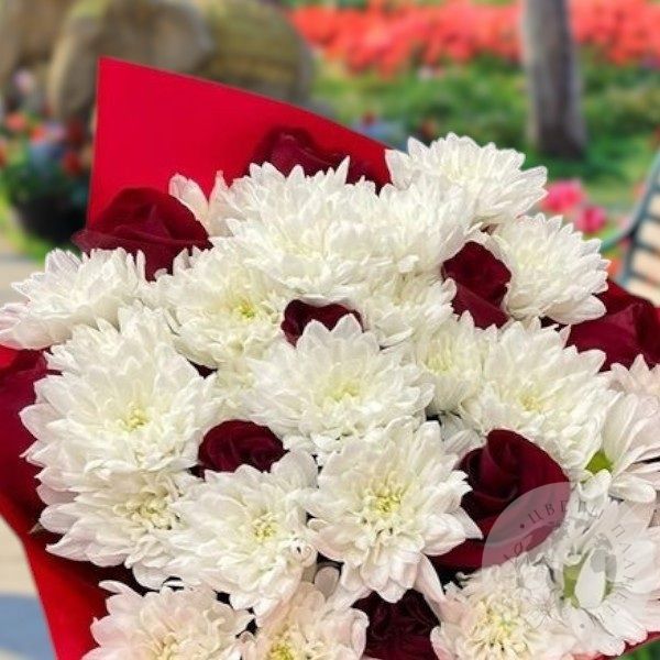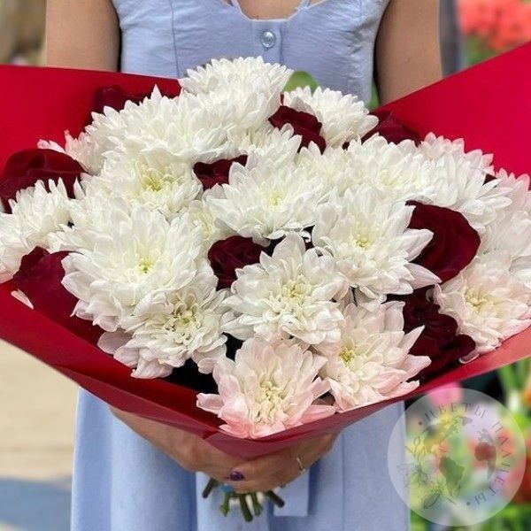 Букет из белых хризантем и красных роз