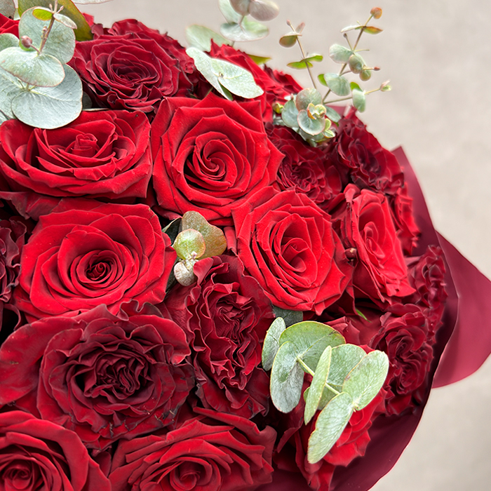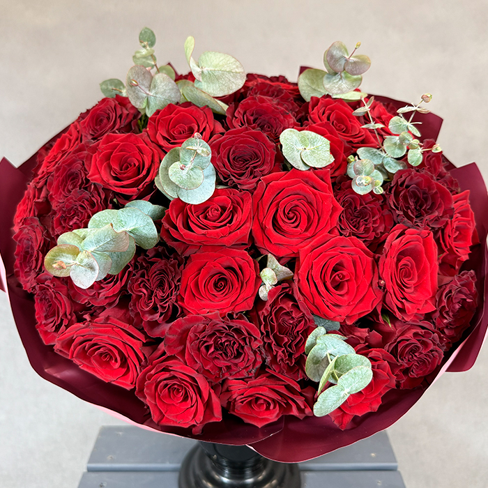 Букет из красных роз Эквадор с эвкалиптом 51 шт. 50 см.