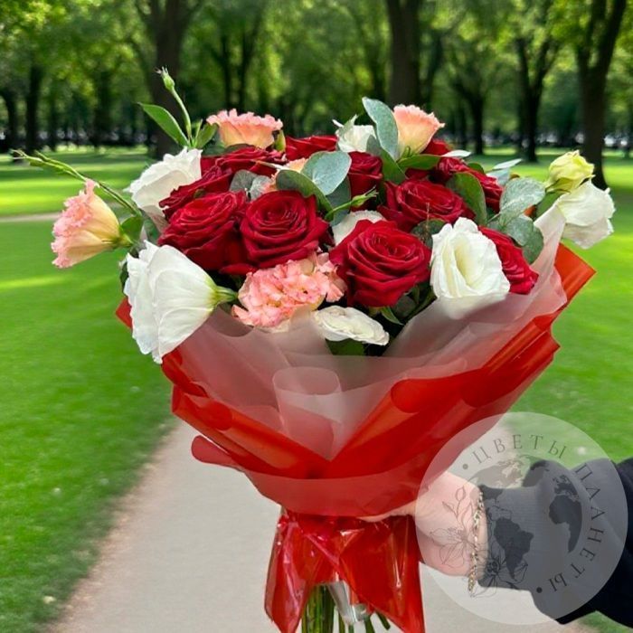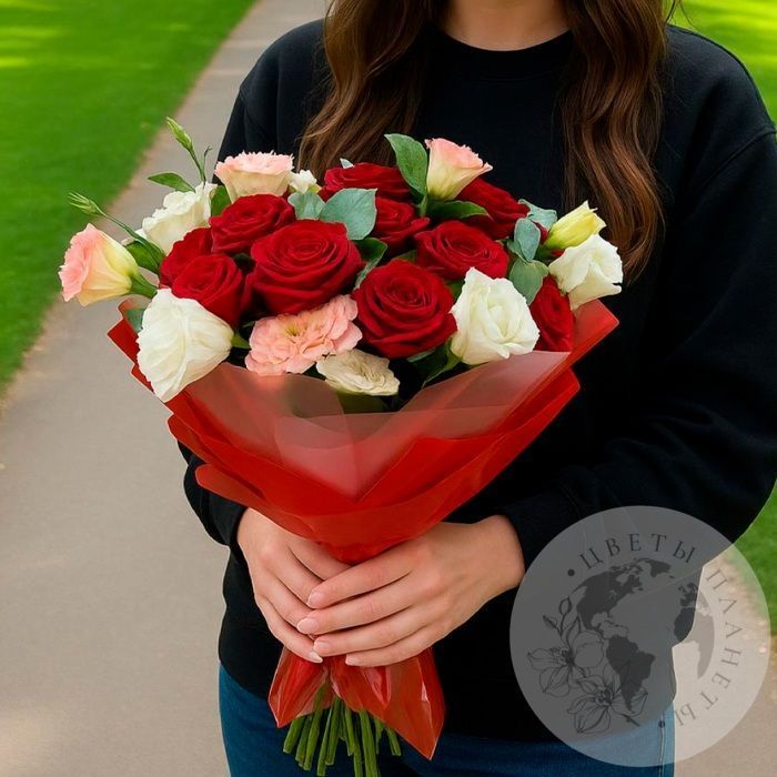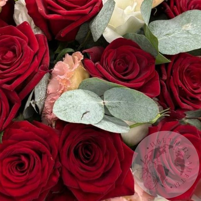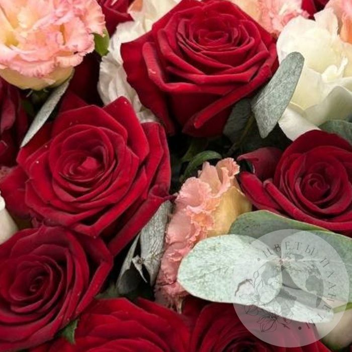 Букет из роз, эустомы и эвкалипта