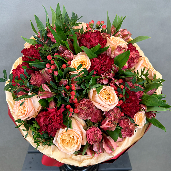 Букет из роз, гиперикума, фисташки