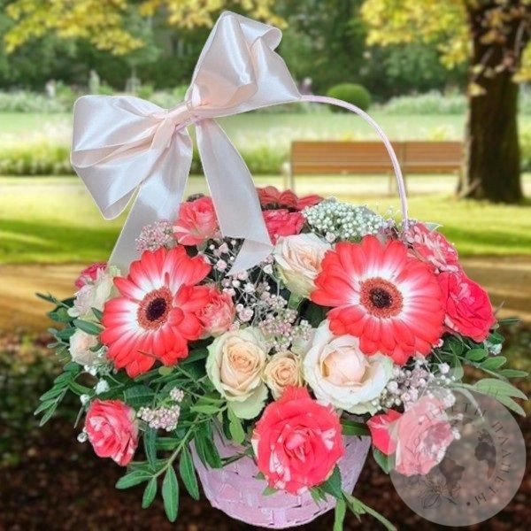 Композиция из роз и гербер в корзине "Отличное настроение"