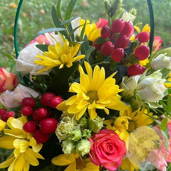 Композиция из кустовых хризантем, роз и эустом в корзине