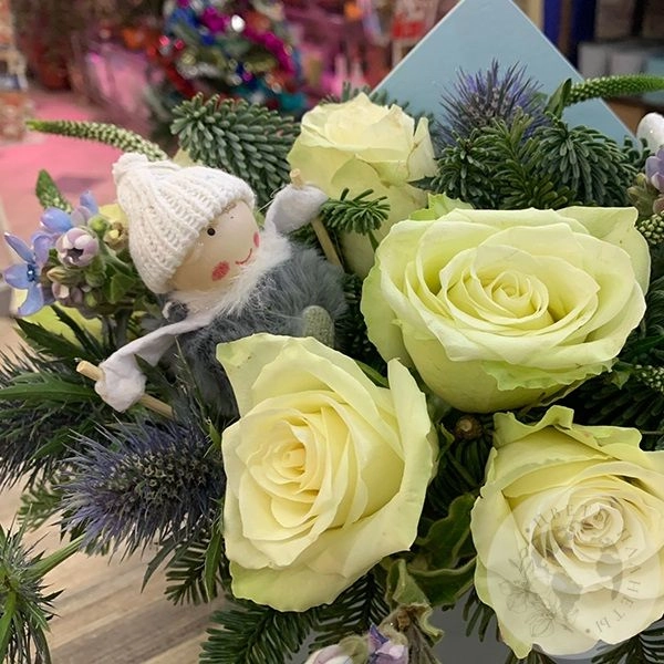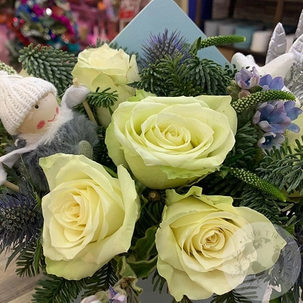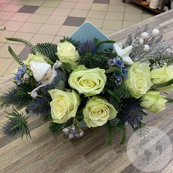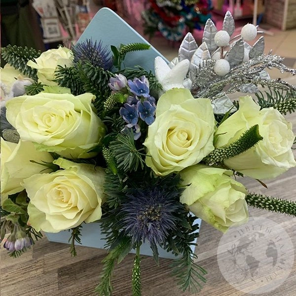 Композиция из роз и вероники в ящике "Голубой конвертик"