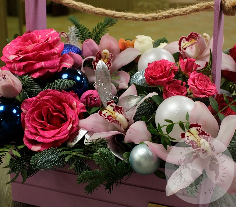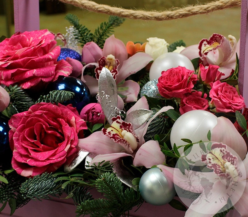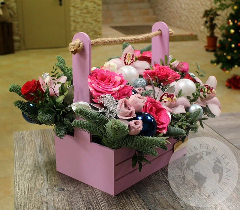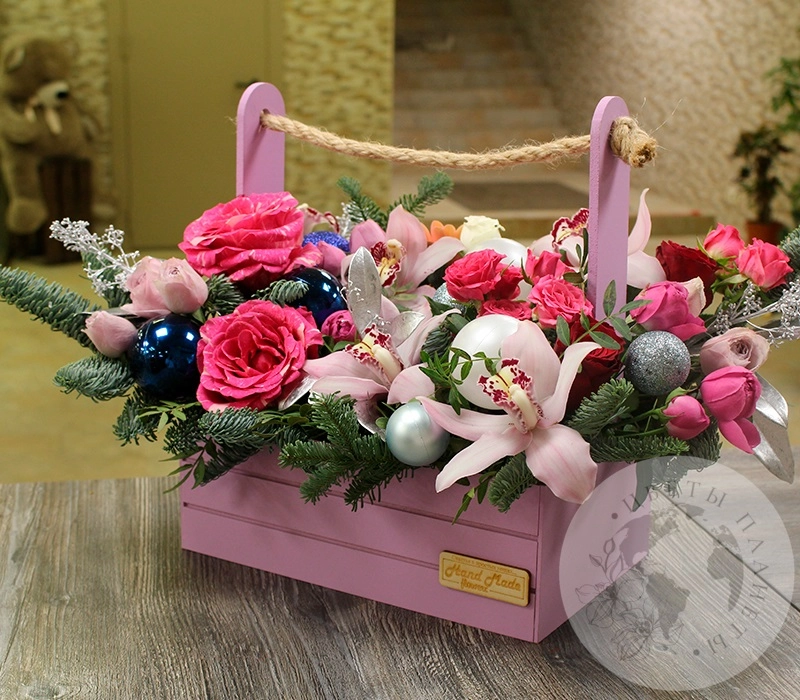 Композиция из гвоздик, альстромерий и роз в ящике